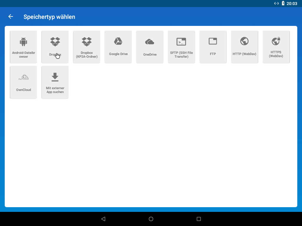 Klicken Sie dann im folgenden Bildschirm auf das Symbol, welches zu Ihrem Cloud-Service passt. Also entweder Dropbox oder Google Drive, OneDrive, etc. Hier werde ich mit der Option Dropbox weiterfahren.